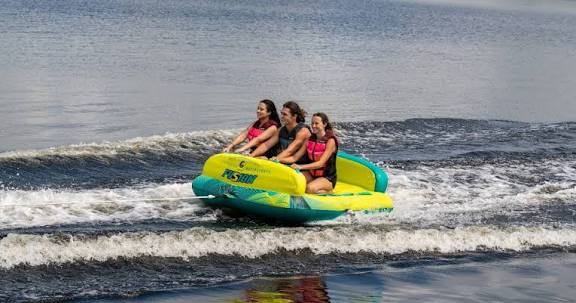 - Two prone riders or three riders sit-on-top on this innovative 90° Two-Way Tow tube