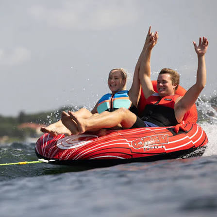 Get ready for a thrilling ride with the Racer 2 Classic Cockpit Tube. Designed for 2 riders, its 60" L x 65" W partially covered cockpit and low center of gravity ensure a stable, exciting experience. The durable 420D Nylon cover and 4 padded handles with knuckle guards add safety. The Boston valve allows for easy inflation, and the covered mesh bottom keeps water at bay. Includes a repair kit and a 1-year warranty.