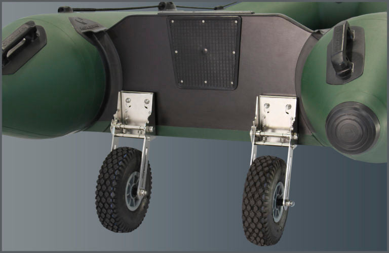 Stainless steel transom wheels are designed for inflatable motor boats and rigid hull dinghies, providing easy transportation on land. The inflatable rubber tire ensures excellent grip and cushioning, allowing smooth movement over sand, gravel, and other surfaces.